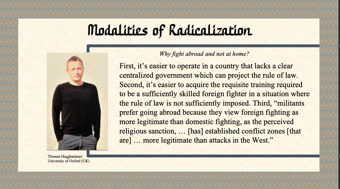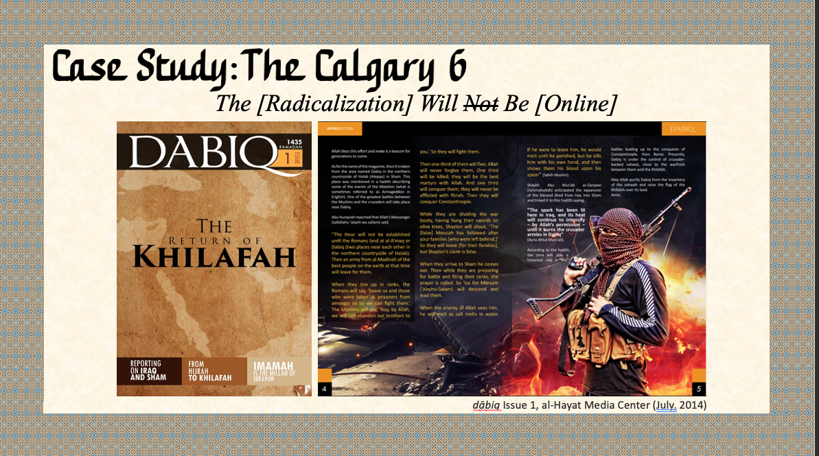 In the fall of 2014, the Canadian news media was awash with stories of Canadian nationals (roughly 120 in total) electing to leave their families, jobs, and schooling – virtually every aspect of their lives behind to travel to Syrian to fight for the Islamic State (ISIS). Why would Canadians from all over the country, who were generally well educated, sufficiently integrated into their local communities and often not initially overtly religious choose to join ISIS? The globalization of the call for, and radicalization of foreign fighters has only escalated with the mass availability of jihadist literature, YouTube videos glorying ISIS, and dodgy message board shaykh’s acting as gate keepers to joining the fight overseas. Recalcitrant forces within contemporary jihādist groups have gone to considerable lengths to elevate specific Qur’anic narratives and ḥadīth interpretations to not only justify violence, but also to attempt to compel adherents to take on the mantel of jihād. A veritable cottage industry has grown up around the production of jihadist publications (specifically magazines), where lay Islamic scholars employ questionable ijtihād (independent reasoning) methods and draw on fringe jurist’s opinions that are well outside of existing ijmā (community consensus) as a means to foster a canonically derived justification for violence. The resulting production of lay scholarly reasoning are jihadists magazines, which are a core component in both the recruitment and radicalization of fighters. Therefore, the expressed goal of this project will be to conduct a micro-study on one group of jihadi hopefuls who all attended the same mosque in Calgary, Alberta. The paper will explore questions pertaining to: what jihadist literature were they reading; what other media were they consuming; how did they gain access to this material; and what social or community factors could have influenced their desire to fight for the Islamic State? The resulting output of this project will be a clear study of one jihadists cell path to joining ISIS, with some suggestions as to what the public could have done to redress this type of radicalization within a community context.